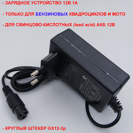 Зарядное устройство 12В 1А для аккумулятора детского бензинового квадроцикла со штекером gx12-3p (круглый).