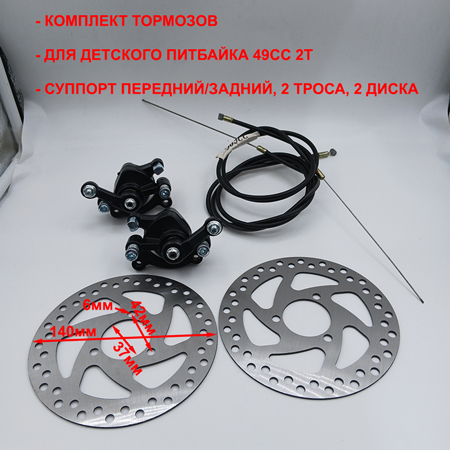 Комплект дисковых механических тормозов для детского мотоцикла (детского питбайка 49 куб 2Т) MOTAX, ORION 50, KAYO DBR SX50-A, KXD 701A с бензиновым 49сс 2Т или электрическим двигателем. Комплектация: суппорт передний, суппорт задний, тормозной диск передний 140 мм 37х42 2 шт, трос переднего тормоза, трос заднего тормоза.