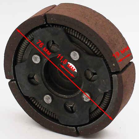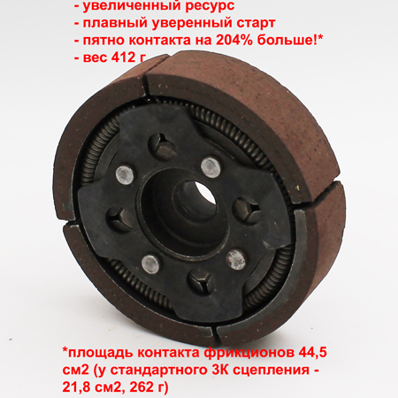 Это наиболее надежный вариант с 4-мя усиленными пружинками по сравнению со стандартным 3-х кулачковым. Устанавливается как со шпонкой, так и без.2-х кулачковое стальное сцепление с двумя фрикционными накладками для детского квадроцикла, мотоцикла, минимото, миникросса с 2-т двигателем объемом до 49 см3. Особенность - усиленные пружины, повышенная устойчивость к перегреву по сравнению со стандартным вариантом.