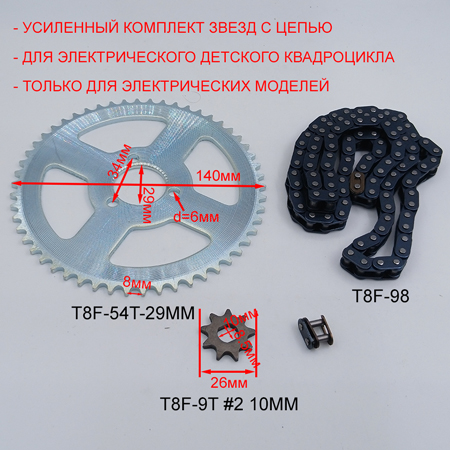 Усиленный комплект звезд с цепью для детского электрического квадроцикла с двигателем 500, 800, 1000 Вт. Комплект: цепь T8F 98 звеньев (шаг цепи 8 мм) + ведущая звезда T8F 9T (под цепь T8F, количество зубьев 9, шаг 8 мм, диаметр посадочного вала 10 мм (10х8,5 мм), внешний диаметр 26 мм) + ведомая звезда T8F 54T (под цепь T8F, количество зубьев 54, шаг 8 мм, диаметр внутреннего отверстия 29 мм, внешний диаметр 140 мм) для детского электро квадроцикла. Комплект подходит только для электрические квадроциклы.