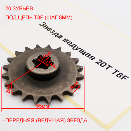 Ведущая звезда 20T T8F для миникросса, детского квадроцикла, оборудования. Под цепь T8F, количество зубьев 20, шаг 8 мм, диаметр внутреннего отверстия на вал 14 мм, внешний диаметр 54 мм.